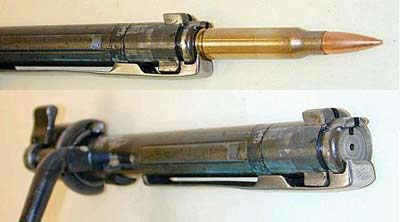 The rifle has a bolt-action and uses 7.92 x 57 mm rounds (referred to as 8 mm Mauser). It has an effective range of about 800 metres, but when fitted with a high-quality rifle scope, its range increases to 1,000 metres. The K98k has a 5 round internal magazine and is loaded from either 5 round stripper clips that are inserted into a slot in front of the opened bolt and pushed into the magazine with the thumb, or, rounds may be loaded one at a time, allowing for topping off a partially empty magazine. A trench magazine was also produced that could be attached to the bottom of the internal magazine by removing the floor plate, increasing capacity to 20 rounds, though it still required loading with 5 round stripper clips. Over 14 million of these rifles were produced by various manufacturers. However, this number includes versions of the rifle other than the K98k, such as the Czech vz-24 which continued to be produced during WWII.